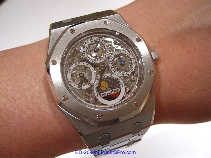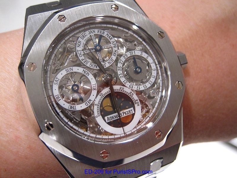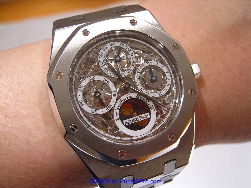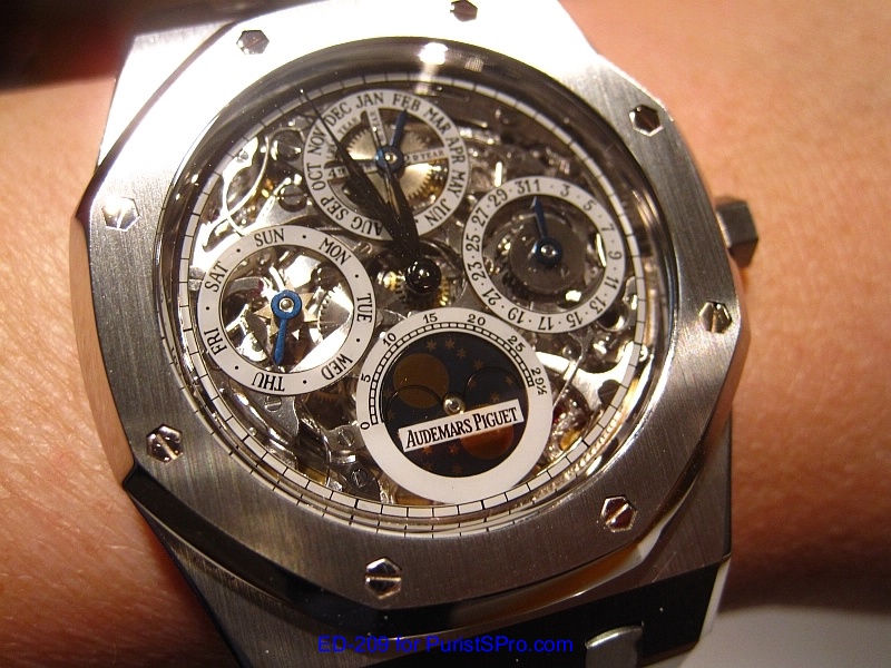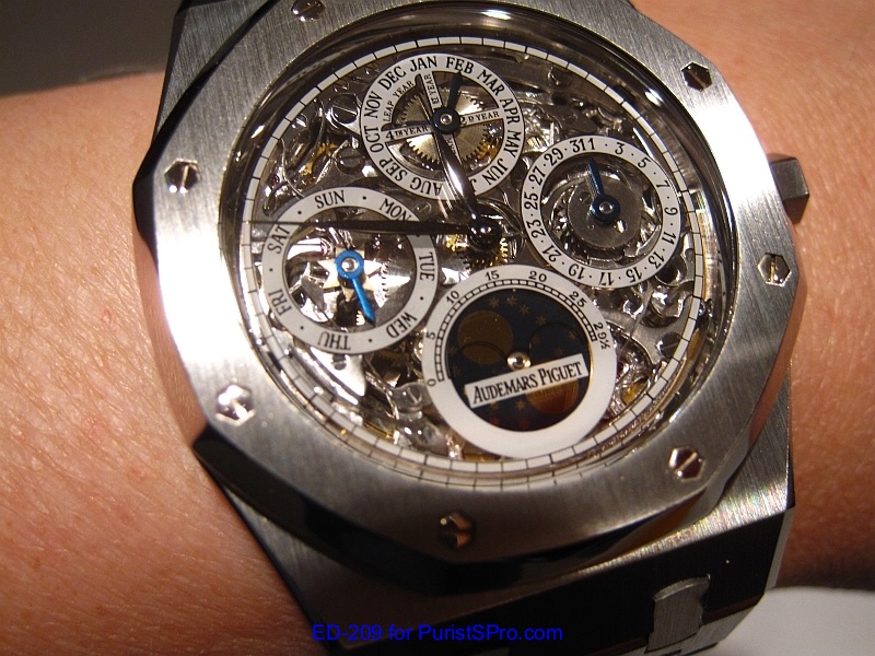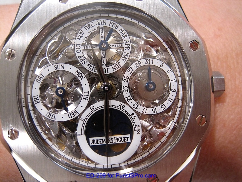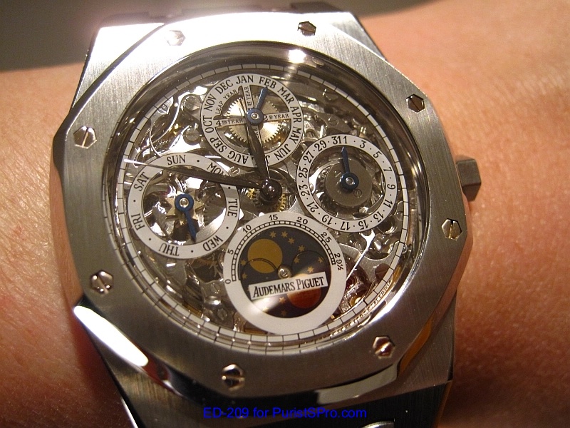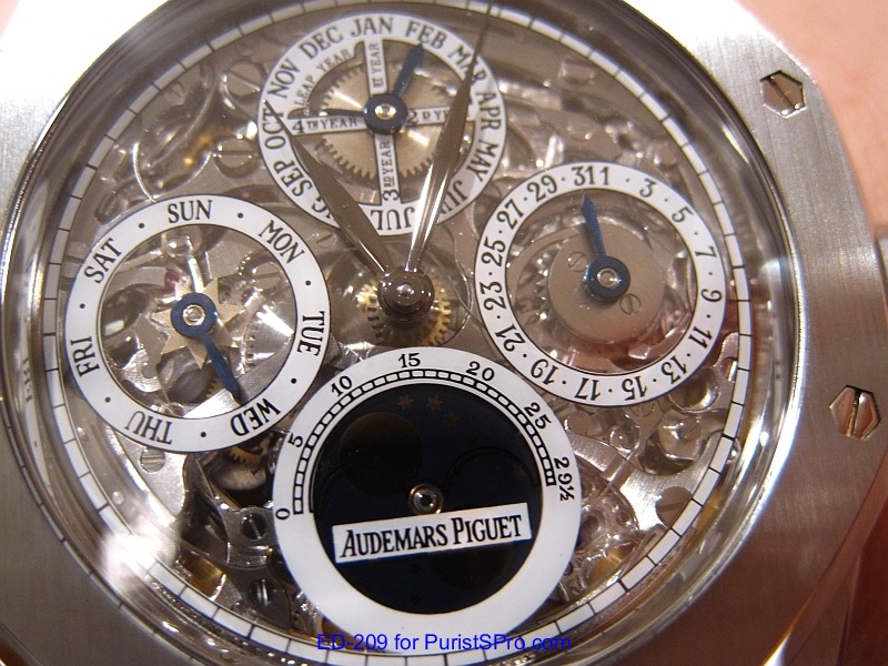 Well fast forward to 2011 when I made a trip out to (where else?) Las Vegas to attend IGOTT2. I’ve been seriously thinking about getting another AP Royal Oak Perpetual Calendar mainly for the transparent caseback and the leap year indicator. A fellow PuristS was wearing the model 25829ST which is the perpetual calendar skeleton version. It was so beautiful that I knew that I had to get one.