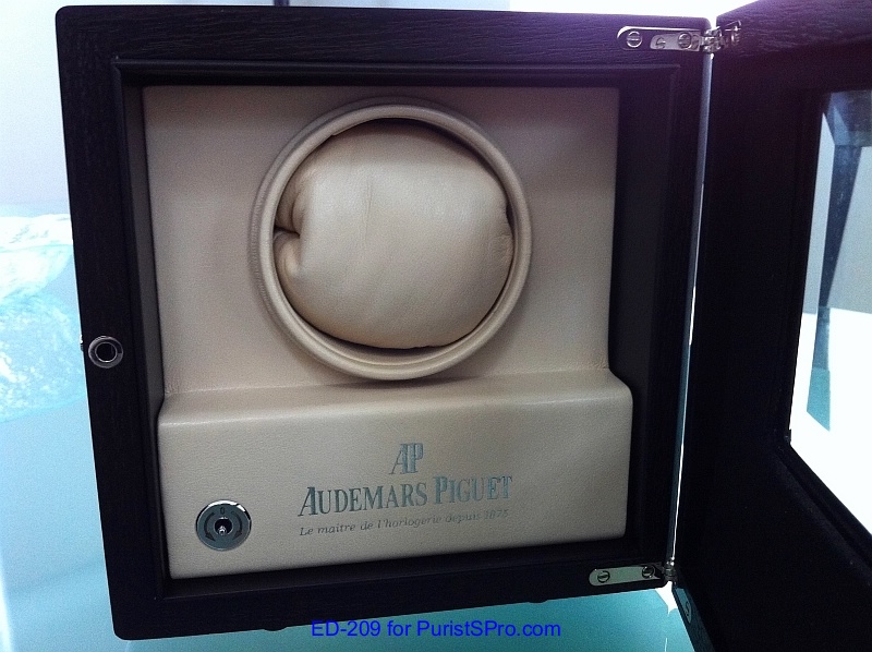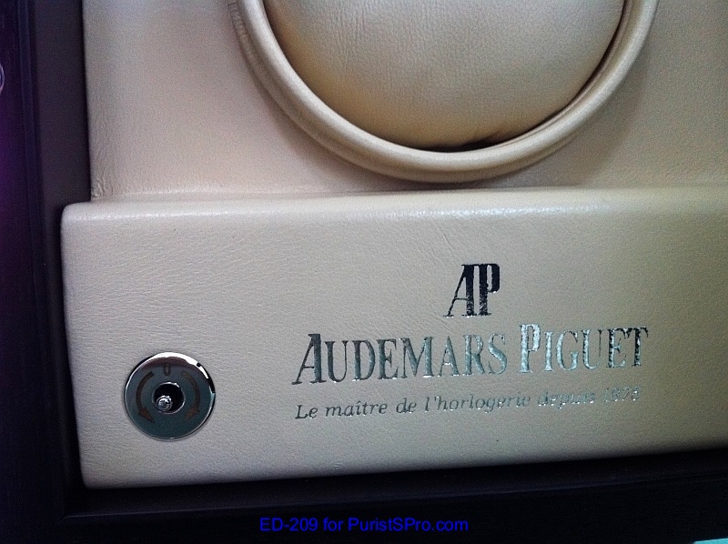 Luckily I haven’t really need to pull out the stainless steel stylus to make any adjustments. I usually wear this perpetual calendar on a daily basis but on weekends I sometimes put it in the winder to keep it fully activated. My Royal Oak does come with it’s own winder which is also the storage box or as the AP instruction booklet calls it ‘presentation case’. The exterior is the typical wood finish of the Royal Oak boxes with a dark slightly reddish tinted wood. It has a faceted glass display window and is a little bit larger than the regular box.