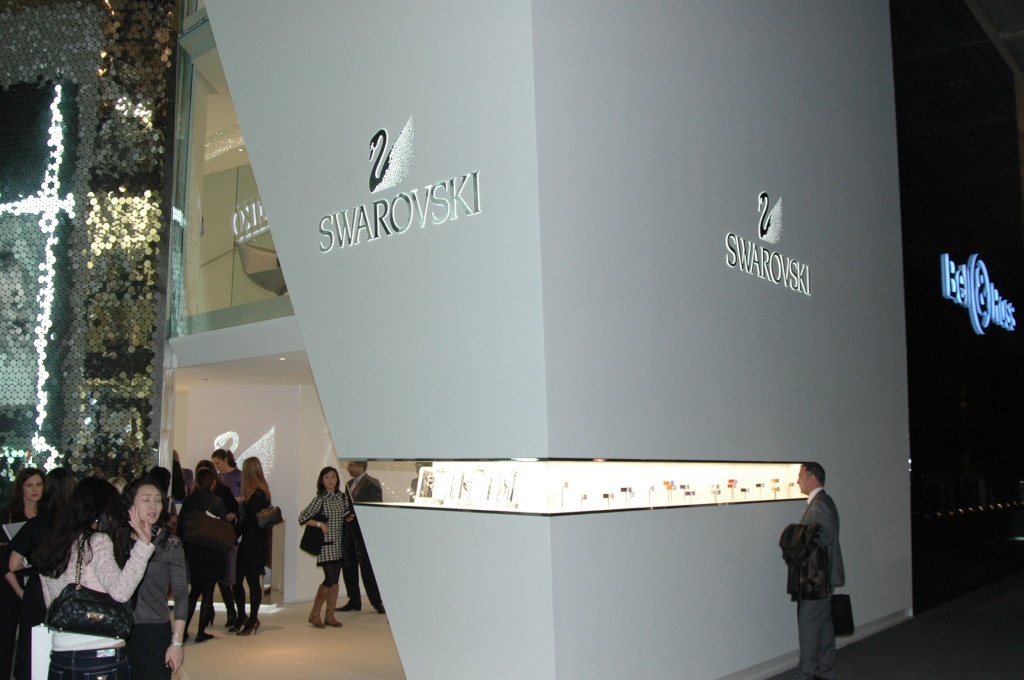 Photos of brand booths. The designs of the many booths are tasteful and are quite reflective of their respective brand elements and are consistent with their boutique store designs. The elaborateness and the size of the booths can show-off the brand's strength and resources.