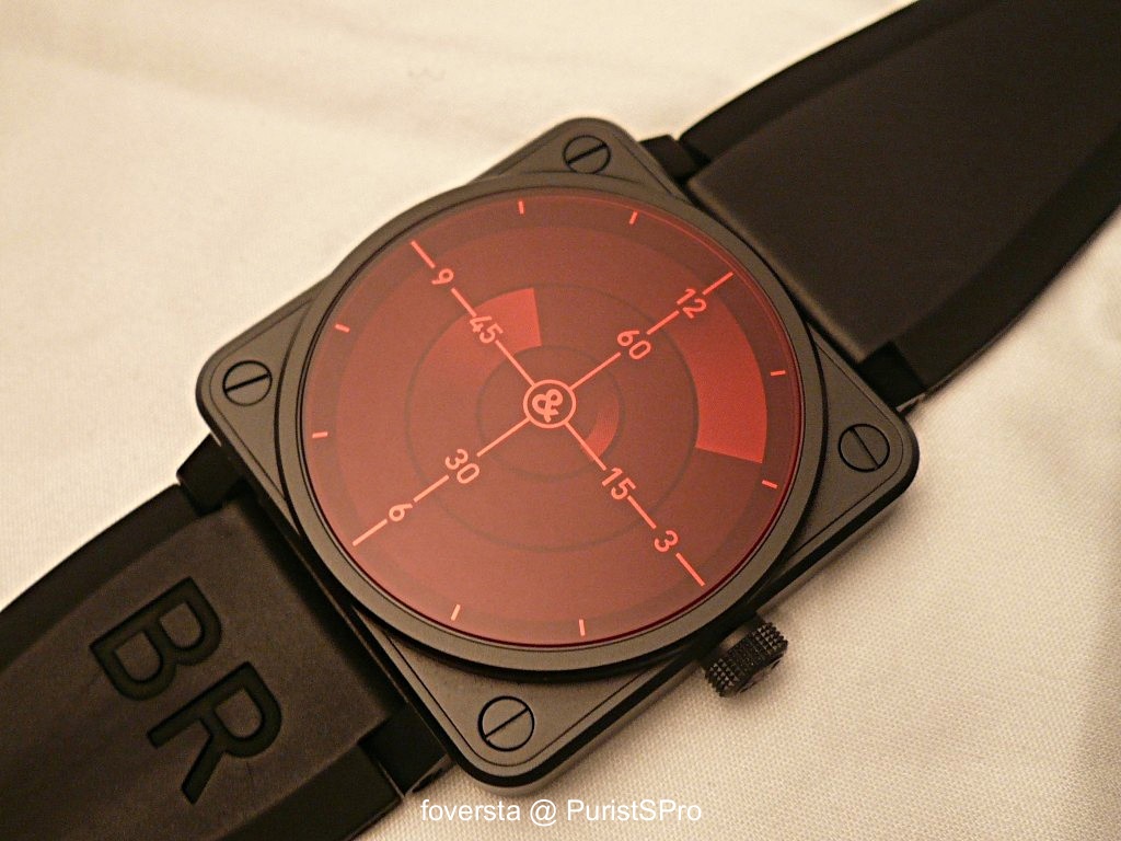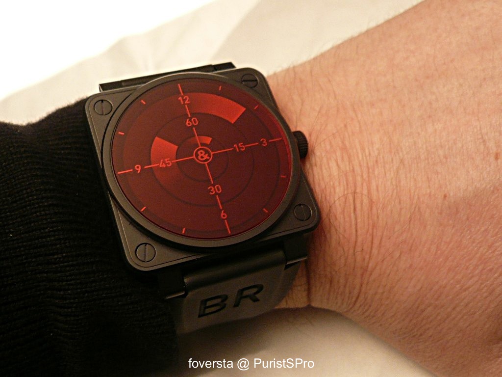 Radar. The idea of the Radar is interesting due to its coherency with the inspiration of the Bell&Ross watches. After all, when a lot of watches are an expression of the aeronautical world, we are not surprised to find a Radar watch. This year, Bell&Ross presented a worthy evolution of its Radar watch which was unveiled in 2010. If I found the 2010 Radar a bit disappointing (the watch was not very fun at the end... if not boring), Bell&Ross tried this time to really take advantage of the true radar display to bring to the owner of the watch the feeling to wear an instrument "closer" to the real thing. This changes a lot its interest: the designers managed to create the sweeping effect of the light beam.Of course, this effect is mainly visible on the second disk which is fast enough to create it. The hours and minutes disks are too static for this purpose but they were nicely designed. In a mechanical point of view, we find again the caliber ETA 2892. Don't expect here an impressive horological work: it is not that complicated to create this type of time display. The main issue was to lighten the disks in order that they require less energy from the caliber which is not, for me, the best in terms of winding efficiency. The red-tinted cristal and the scales on it contribute a lot to this feeling to be in an air-traffic control atmosphere. A good improvement from Bell&Ross.