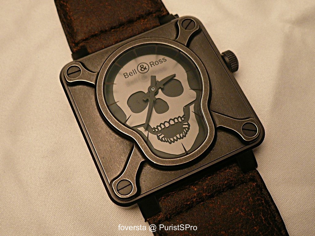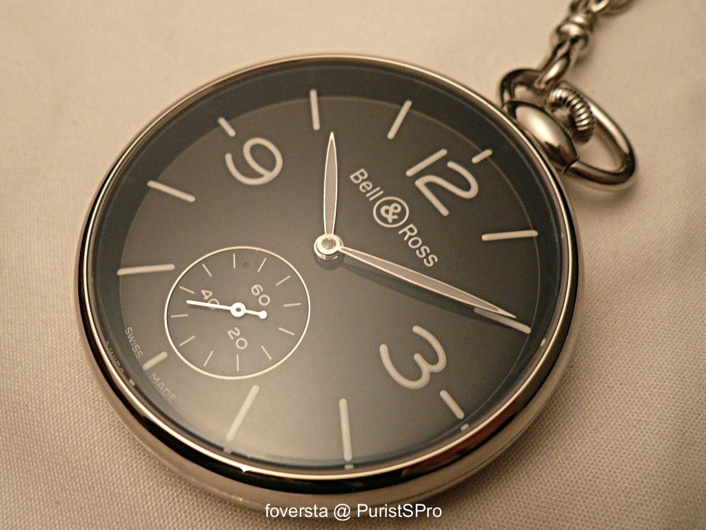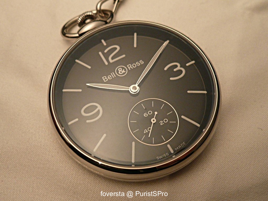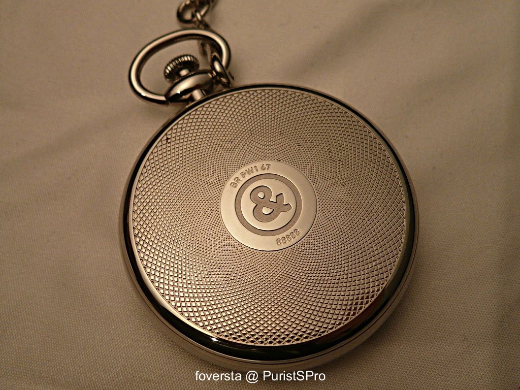 BR-PW1. This pocket watch uses an Unitas 6897 caliber and has a 49mm stainless-steel case. I like its dial and thanks to the Unitas caliber, it looks very balanced. The work on the caseback is OK, nothing surprising. I would have prefered a more original ring: Bell&Ross designed it without any originality, maybe something a bit sharper would have been nicer. And we don't have to forget a lot of various pocket watches rings were available. A room for maneuver was available to the Bell&Ross designers. Anyway, the watch is nice, very "Bell&Ross" in its style. But some details would have required a more sophisticated approach IMHO.