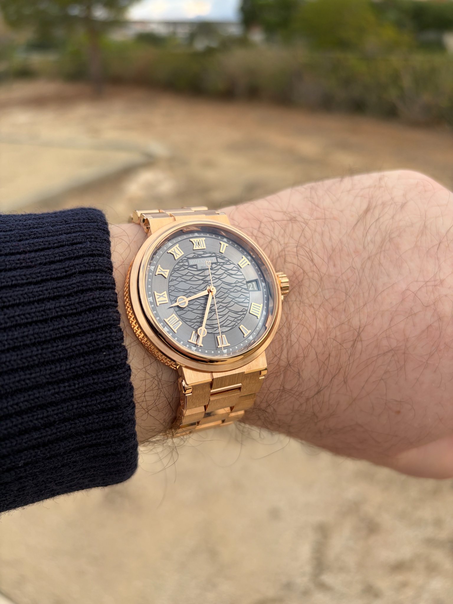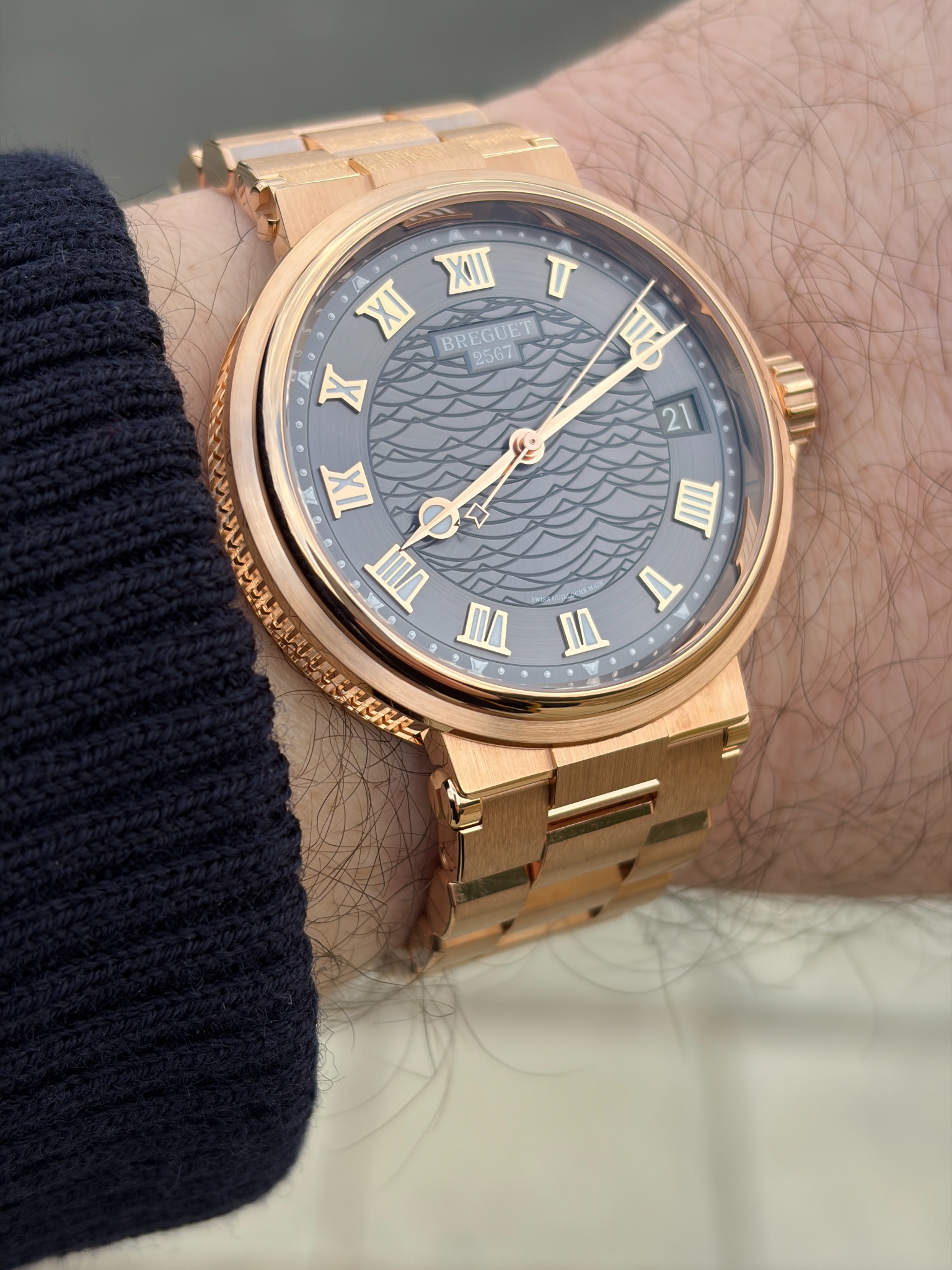 This redesigned Breguet Marine doesn't get much love, especially compared to the previous editions. I must say that I liked the traditionally guilloche dial and nautilus or seashell rotor of the previous editions very much (whereas I like the ship's wheel rotor a little less). But I've always felt that this redesigned edition deserves much more attention and affection than it gets and your photos fully confirm my feeling. The watch looks gorgeous on your wrist and to have a full gold dressy spor