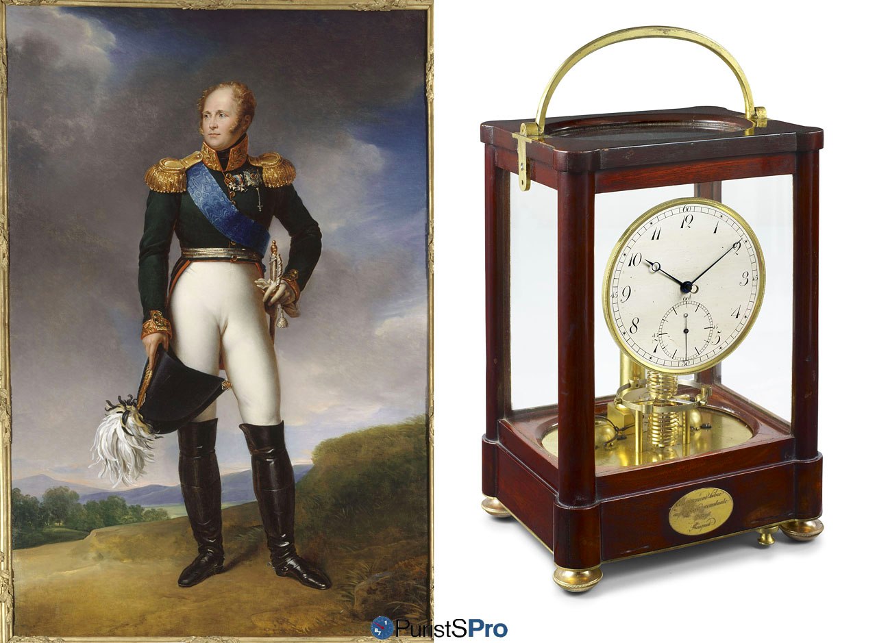 The Breguet N° 423-5 was sold as well in the year 1809 to the Russian Tsar Alexander I. in St. Petersburg at the inprecented high price of 14.000 Gold Francs. Originally it featured a „Sympathie“-mechanism which has later been removed, also its partnering clock is missing. As technical delicacy the watch is driven by a constant force mechanism.