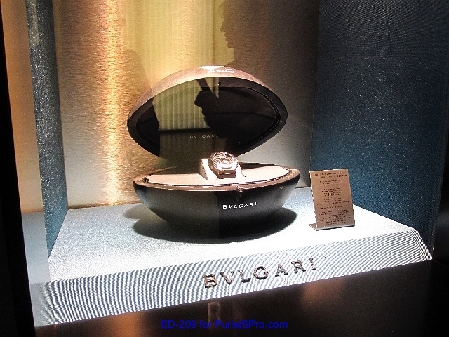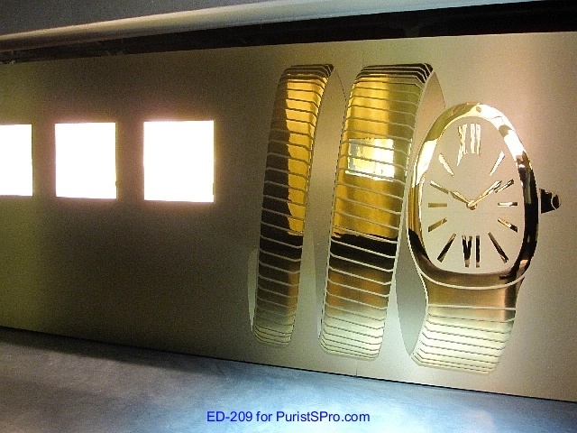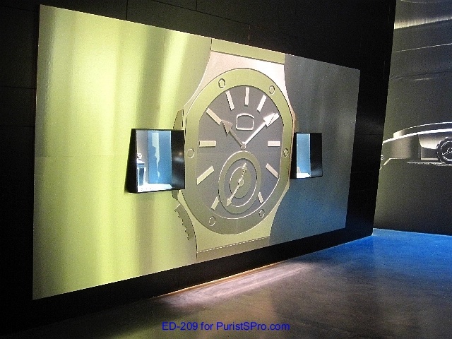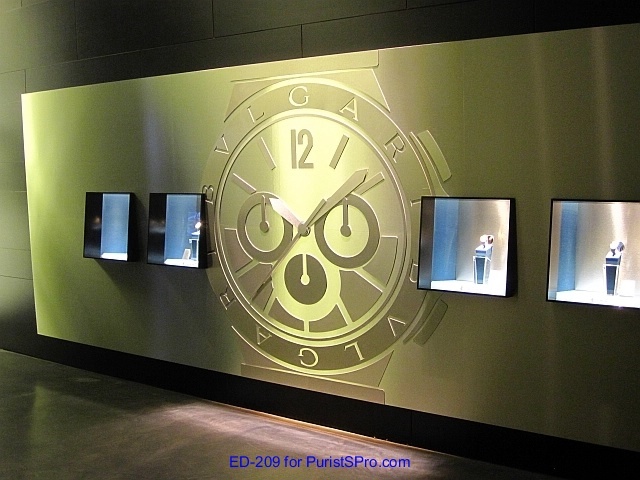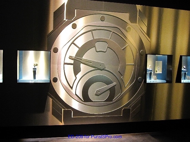 So what hidden treasures are being displayed in the almost pitch black exhibit rooms on the lower level? Bulgari watch masterpieces collection! The first was the Bulgari Gerald Genta Octo Grande Sonnerie Tourbillon. This complication has 4 gongs that are capable of operating as a Grande Sonnerie and Petite Sonnerie, as well as Westminster chime. The other display case had the Bulgari Gerald Genta Magsonic. My first experience with this watch was a special private showing during a PuristSPro GTG