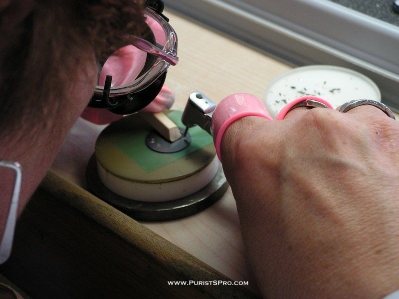 The last step that we see is mounting of indexes and inserts on the dial. The indexes and inserts all have at least 2 feet that hold the insert on the dial. The diameter of the feet is about 0.15mm. In the first picture we see that the insert is held to the dial with a weak sticky tape, then while holding the dial down the insert feet are clipped off at the level of the dial.