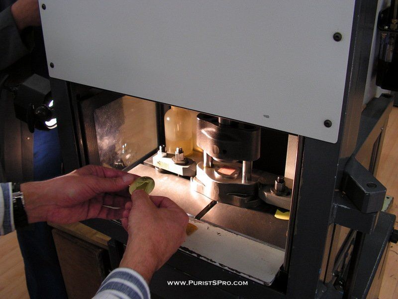Here on a small press a tool is being tested to cut out the final dial shape from the blank.