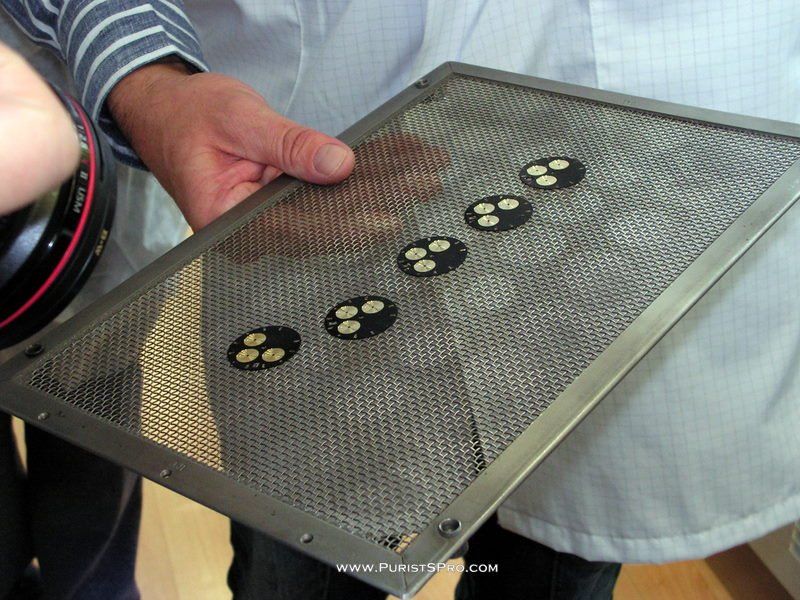 Here we see a fixture for holding a dial for one of the process steps. The fixture has holes to accept the dial feet, which position the dial, vacuum channels to hold the dial to the fixture and extractors which push the dial out from behind so that it is not necessary to touch the dial from the front to get it out. These kind of fixtures and the stamps are all made here in the toolmakers shop.