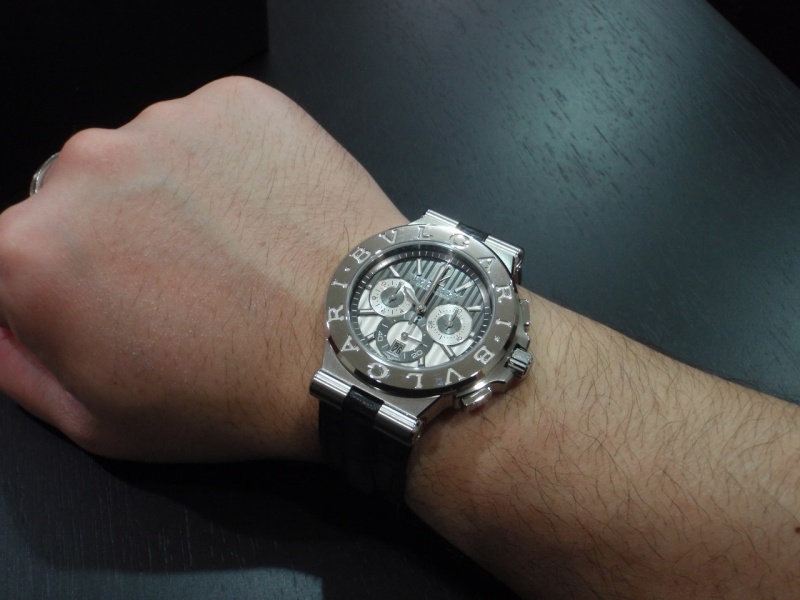 Very cool, congrats on your new watch! I remember your post from a few months ago when you were consider the Sincere versus the SIHH 2011 303 with the thinner bezel. I like the details of the logo on the crown and the dial looks nice too. Interesting on the wrist comparison with the Panerai, I didn't realize the presence of the Bulgari on the wrist. Does your 303 come on a white gold deployant or tang buckle? Thanks for the photo report and enjoy your Bulgari. Regards, ED-209 This message has be