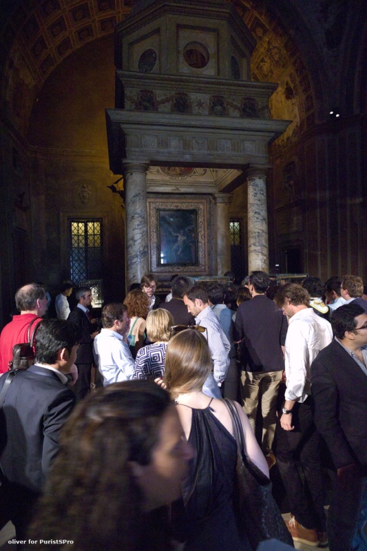 After the presentation, we were able to walk towards the far end of the church to where the watch was on display. I was impressed with how Bulgari put careful thought into even this detail. There is no question that Bulgari is the master of details. Standing in front of the Octo’s display case, I looked directly up towards the ceiling and saw an octagon shaped tower. It was the perfect frame within which to house the new watch.