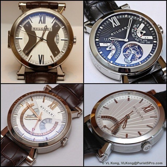 For press material for this model, please click here. Will begin with the special model which commemorates the 125th Anniversary , a tribute to the founder - Mr Sotirio Bulgari. This model consists of yellow gold, pink gold and white gold with silver dial and hunter caseback and is in limited production of 125 pieces each metal. (Note : the model in these pictures is a white-gold case. Due to the lighting, the case colour varies) From the aesthetic perspective, a major modification was done. The