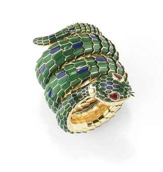 AN ENAMEL AND RUBY SNAKE LADY'S BRACELET WATCH, SIGNED BULGARI