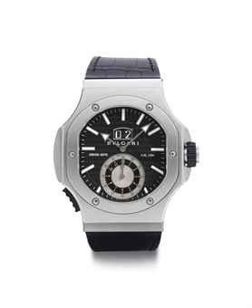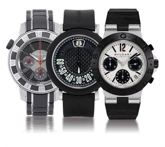 Mechanical movement, first, grey engine-turned dial, subdials for small seconds, 30-minute and 12-hour counters, date display, three-part case in rubber and stainless steel, revolving calibrated bezel, screw down transparent case back, rubber and stainless steel Tiffany & Co. bracelet; second, black engine-turned dial, jumping hour, retrograde minute sector, three-part case in rubber and stainless steel, screwed case back, stainless steel GG buckle, third matte white dial, subdials for small seconds, 30-minute and 12-hour counters, date display, three-part case in rubber and alumnium, snap on case back, stainless steel Bulgari buckle back, case and dial signed