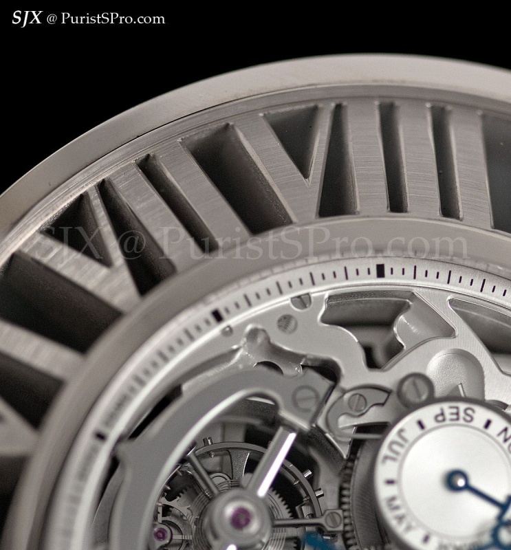 The Roman numerals are actually a single piece, machined from a block of white gold, before being hand finished, like a movement bridge. Over 300 edges of the Roman numerals, front and back, are bevelled by hand. This takes some three weeks to complete, according to Carole.