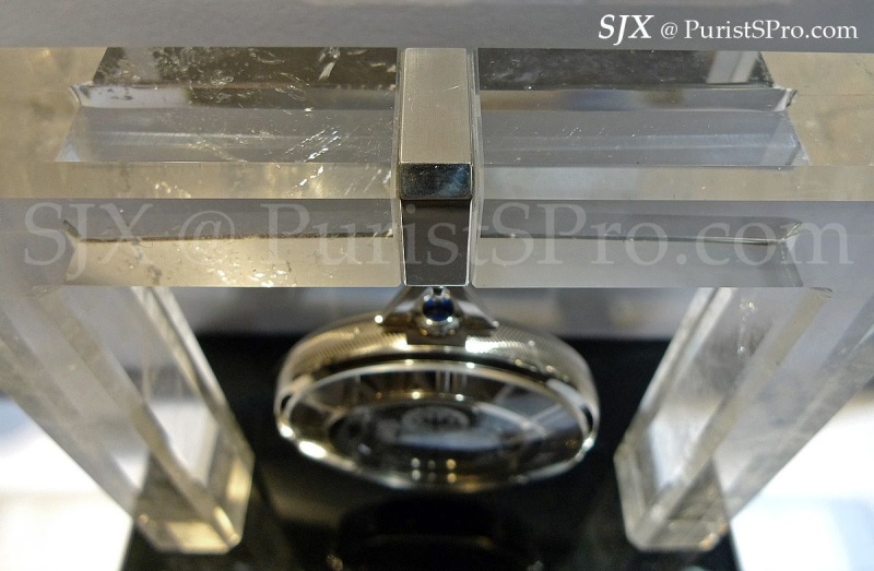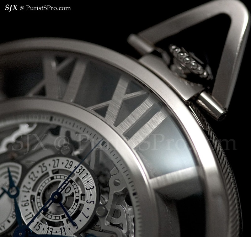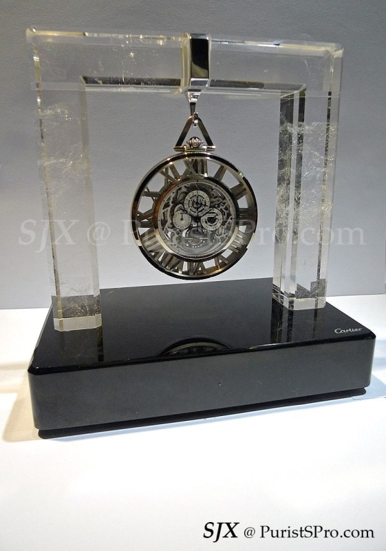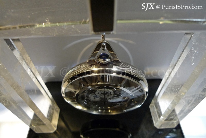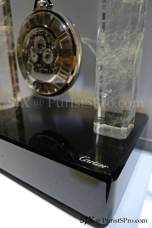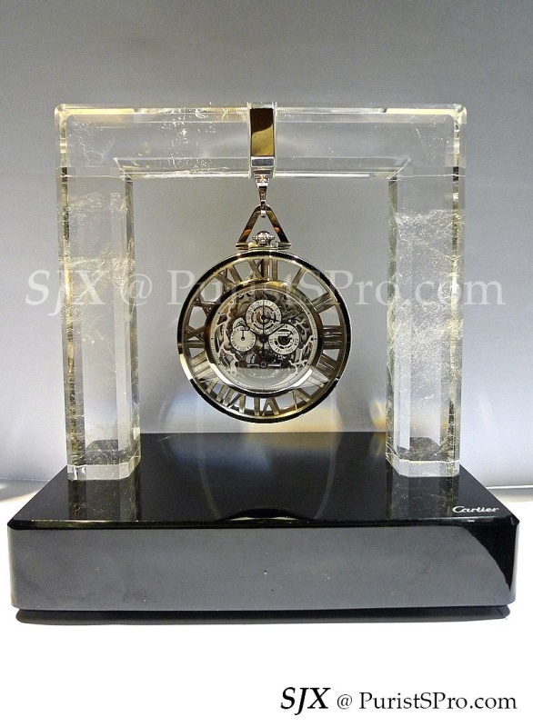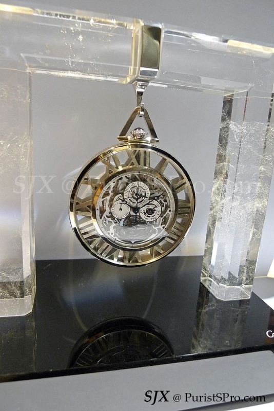 And that is the rationale behind the skeleton Grand Complication pocket watch Cartier will unveil at SIHH 2012. It is presented with a stand made from rock crystal with a glossy obsidian base, complete with a silver hook to hang the watch. Cartier includes a chain, in white gold to match the case, but that’s just a formality in my opinion. Weighing 155.05 g, this will be inconvenient to carry around, unless carried by a minion. This pocket watch belongs on a desk.
