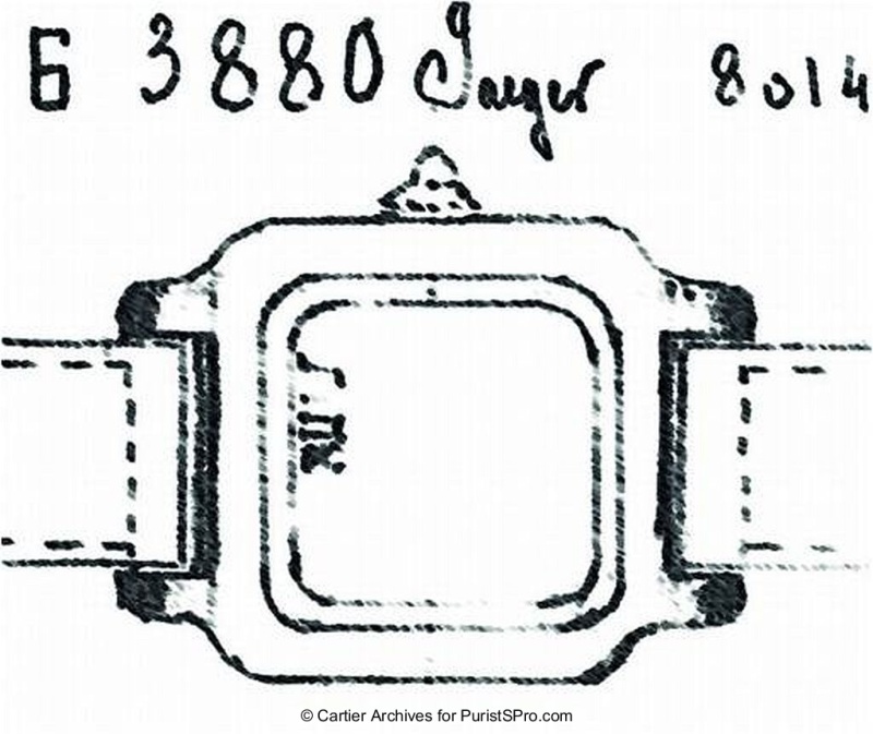 The concept drawing of a 'wrist-worn watch' inspired by the experimental 1904 watch made for Santos Dumont became the production Santos watch; the 1915 production version is shown.