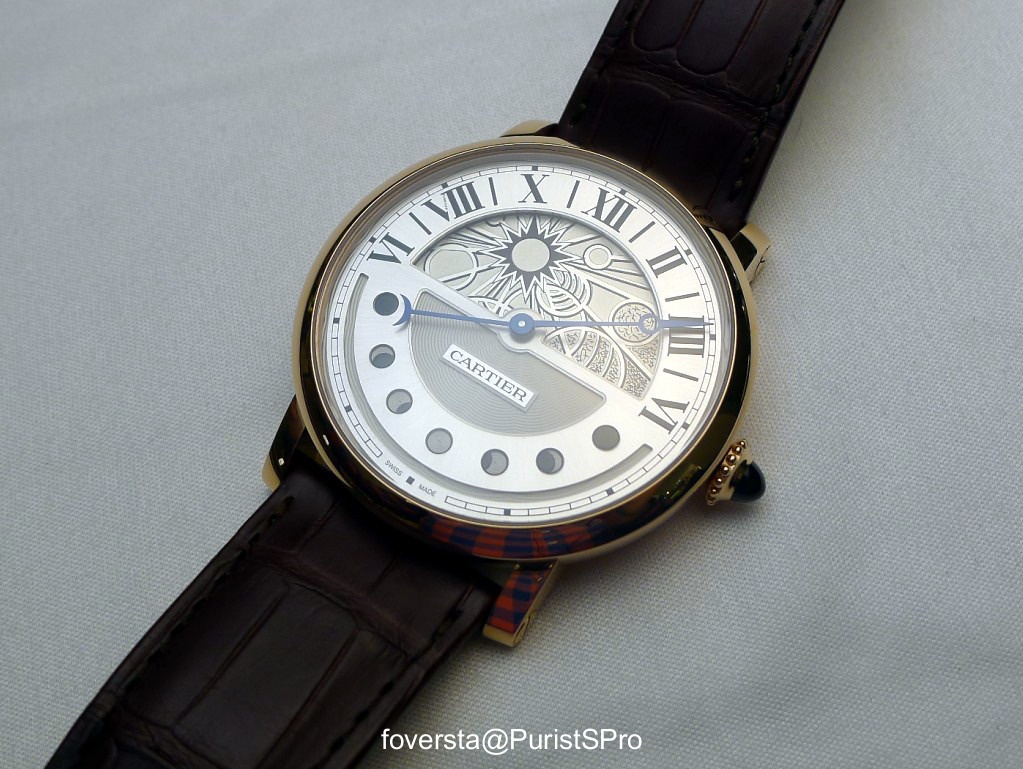 And furthermore, I find that the choice of such additional complication is wise. The moon is depicted both on the upper part to indicate the hours and on the lower part for the complication which is dedicated to it. Moreover, the slow move of the moonphases display is very faithful to the spirit of the disk rotation which is also far from being very swift... Actually, the Rotonde Day and Night creates a different relationship with time. Nothing is speedy on the dial (there is no second hand or any other indicator that the watch is running), everything is peaceful and calm. I almost want to say that this watch is relaxing for our spirit in a world which goes faster and faster everyday. Cartier reminds us here that at the end the flow of time is always the same for anybody. It is just a question of our own perception!