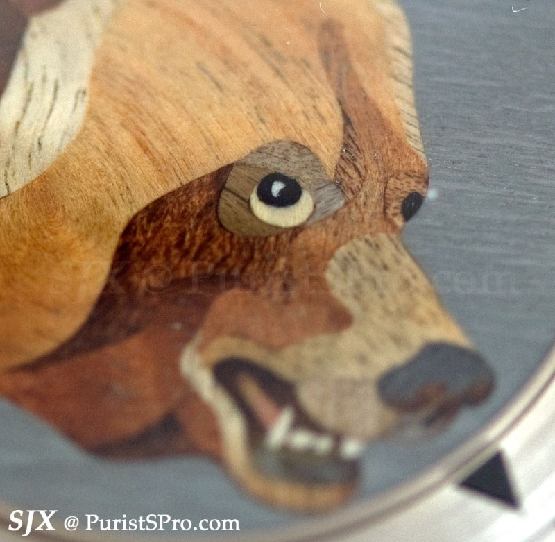 The watch itself is the jumping hours from the Fine Watchmaking collection with a white gold case. Instead of the two-layered, grey guilloche dial of the regular model, the limited edition Metier d’Art version features an exceptional dial. It depicts the head of a brown bear, astonishingly formed out of 38 pieces of wood veneer.