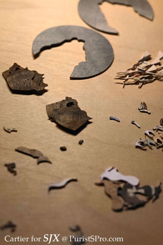 This technique is known as marquetry and is most often found on furniture and items like humidors and clocks, larger items for the most part. In contrast this watch is a mere 42 mm wide in diameter, with a dial about 30 mm wide. The artisan who creates the dial is Jérôme Boutteçon, an award-winning French marqueter who in addition to Cartier has worked for other watchmakers.