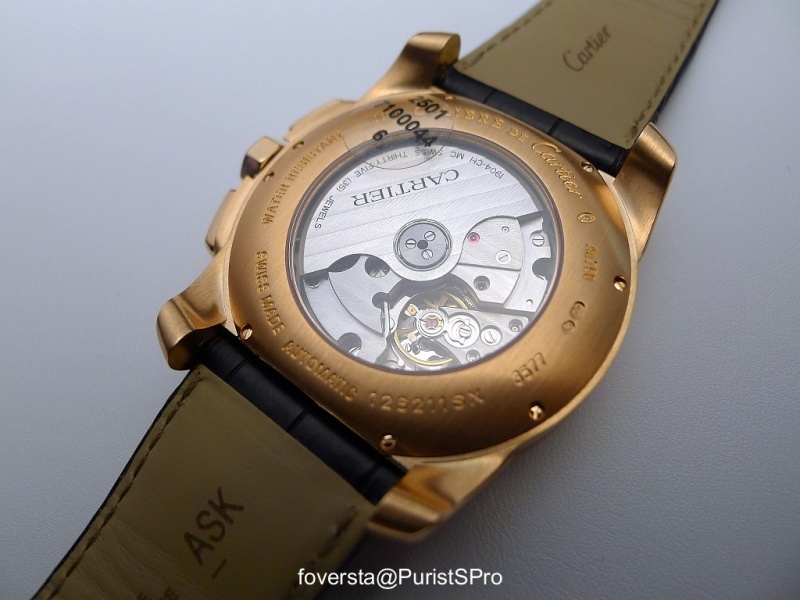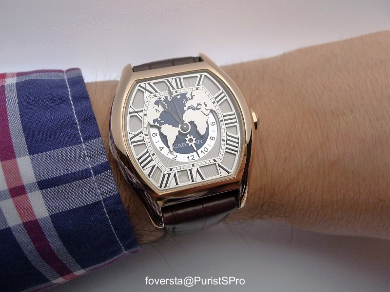 First appearing in a Calibre de Cartier case, for 2013 it is presented as a Tortue watch but with the so called "jet-lag" time difference between Current and Home Time indicator missing.