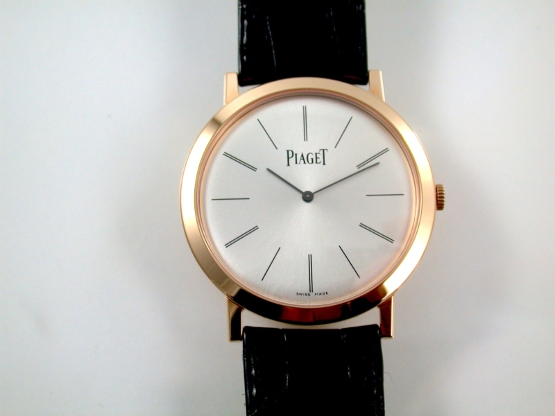 Piaget, like Cartier, uses printing on the dial, but with a much lighter touch, with thinly drawn dashes, alternating in singles and doubles, and it eschews a minute track. The black baton hands are easily legible over the silvered dial, which curves downward ever so slightly at the outer edge.