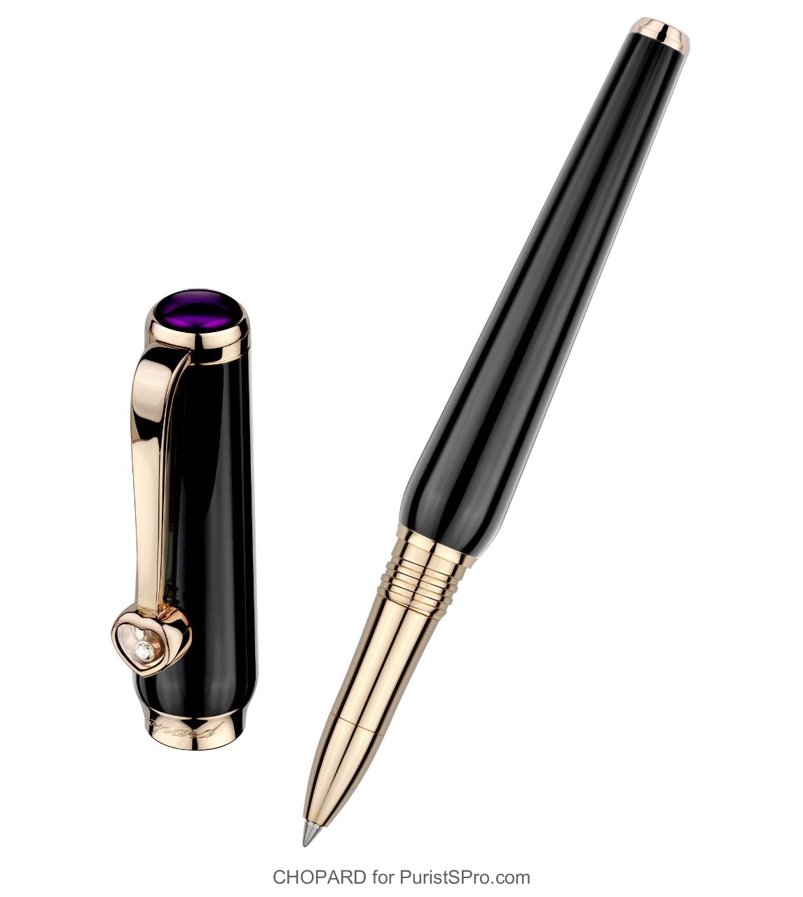 (3) Happy Diamonds roller pen in black resin with rose gold trims, amethyst on the cap and mobile jewel