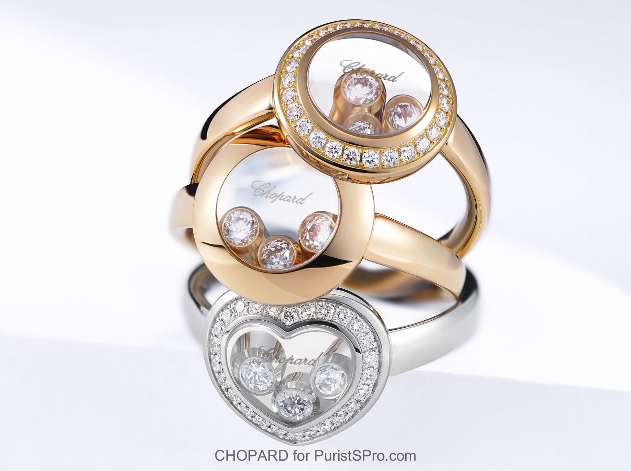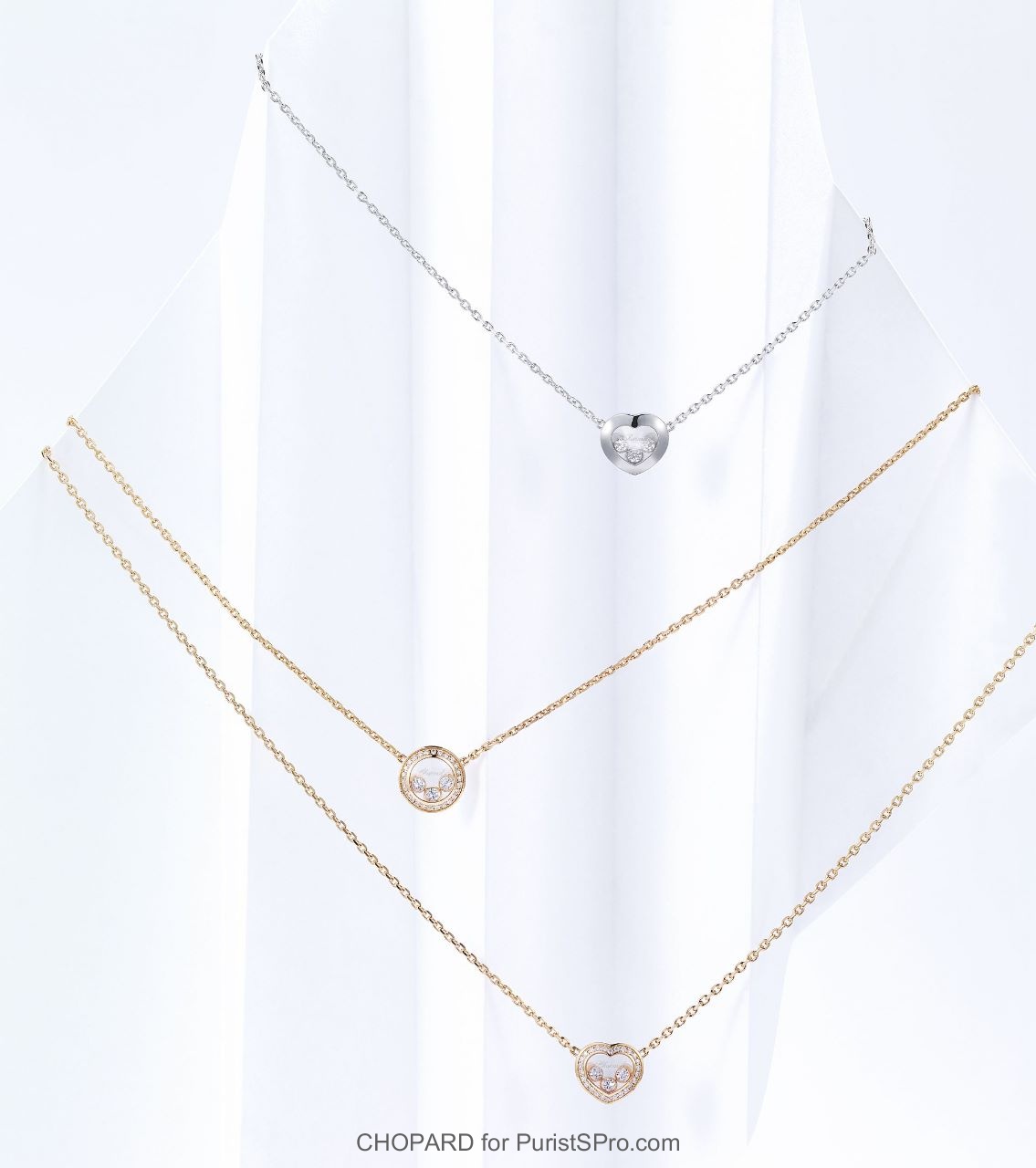 The constantly renewed light effects created by the Happy Diamonds are now further enhanced by a play on volumes in the Happy Curves, as circular and heart shapes featuring cambered, rounded and softened contours blend their steps with the Happy Diamonds waltz.
