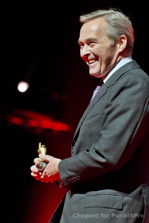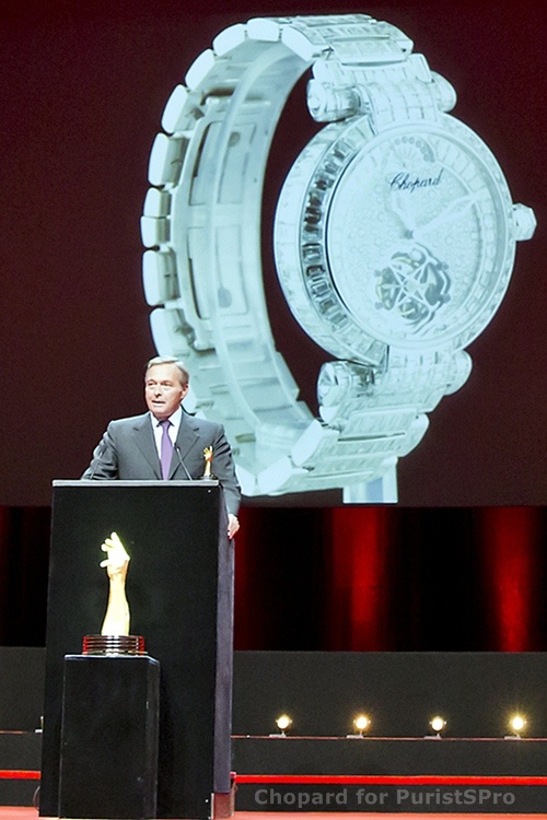 In his thank you speech, Karl-Friedrich Scheufele said: âThis watch perfectly symbolizes the world of Chopard: the symbiosis of two passions, âHaute Horlogerieâ and âHaute Joaillerieâ, and celebrates all the time honoured crafts practised at Chopard. Endowed with an impressive interior to match its equally dazzling exterior, the new Imperiale Tourbillon Full Set embodies a concentrated blend of watchmaking and jewellery expertise â Chopardâs twin domains of excellence. Its chronometer-certified tourbillon calibre bearing the Poinçon de Genève quality hallmark is housed within an 18-carat case and dial entirely set with diamonds and illustrating almost the entire range of gem-setting techniques.