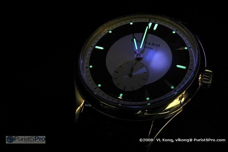 The Hour & Minute hands and hour-indices are coated with Super-Luminova to ensure time is readable even in the dark. The luminescent is very even and last for a while if fully charged.
