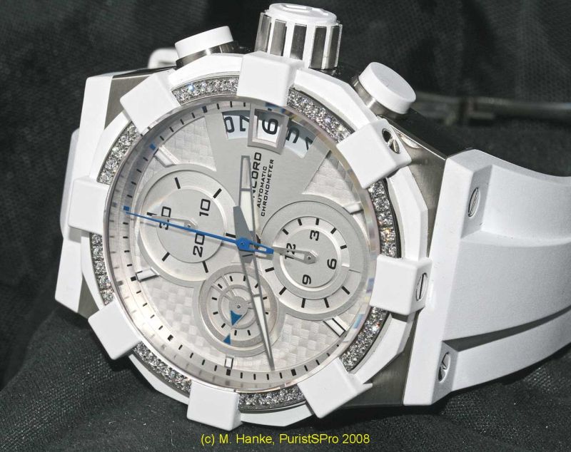 For the ladies, a white C1 chronograph with diamonds is following the most recent fashion trend. I asked the lady wearing it, if the white rubber strap is prone to get stained. She replied, that even coffee stains could be easily washed out with some mild soap water (thank god the watch is watertight to 200 meters!!).