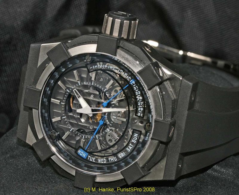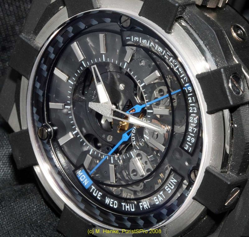 The case is DLC-coated (Diamond-Like Carbon), which makes it almost scratchproof, and results in a beautiful, metallic black surface. Interesting is the worldtime mechanism, made by Dubois-Dépraz. By means of a pushbutton at 2, a ring with 24 cities (=time zones) is moved, and at the same time, the appropriate time there is displayed aside the city name. The city and time display is uniquely displayed, under a blue-tinted sapphire “C” (the pictures here again show a prototype, the final dimensions of the cutout windows will be improved. I really love that piece, and cannot wait to see a final production version!