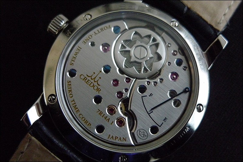 - 7R14 Springdrive movement (an IC-regulated flywheel that spins in one direction serves as the oscillator; an electromagnet then accelerates or brakes the motion as necessary – resulting in a jaw-dropping accuracy of +/- 0.5 seconds per day)