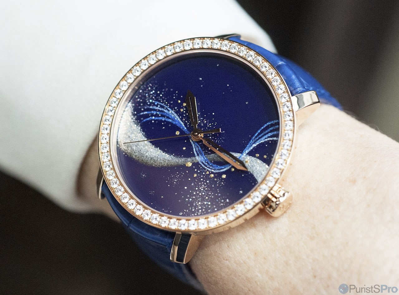 More in line with what the Meyrin-based company usually creates as demonstration of their capabilities, the DeWitt Blue Empire Automatic - presented in a similar (albeit at 36mm; more than a tad smaller) case than the Classic "Moon Abstraction" I presented on the parent post, it showcases all the wonderful decorative arts and crafts DeWitt houses under its roof: The version I chose for this article, a steel case with red gold bezel set with 42 round diamonds (approx. 1.63 cts) and also red gold