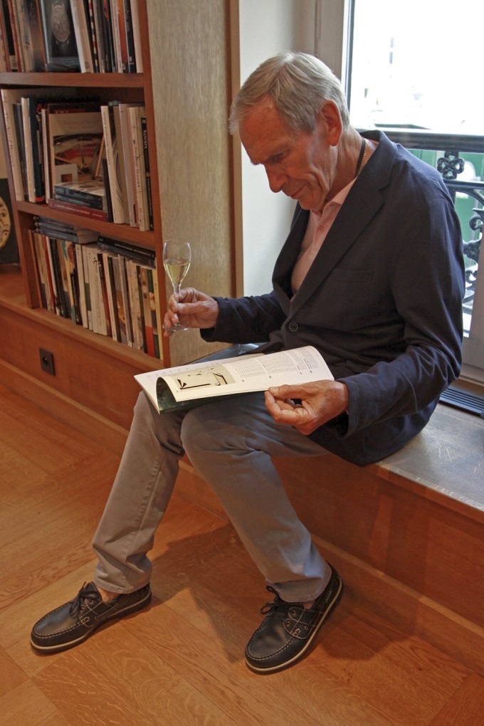 French Auto Racing journalist and writer Jean-Paul Calmus is discovering the latest issue of "Grand Prix":