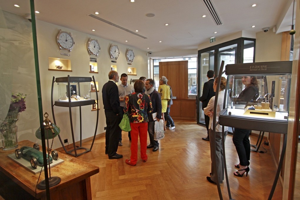 Laure of the FP Journe boutique is presenting a watch to a French motorsports journalist, Cyril Drevet: