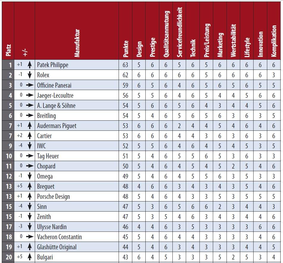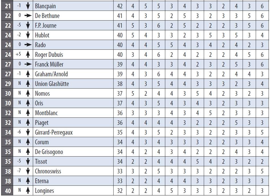 i myself never count on such ranking tables as a guidance for my personal taste , you cant compare oranges to apples unless we are speaking a business comparison based, meaning , we are comparing the brands on business basics, such as how far a brand obtained from it aimed goal by marketing .... and so on . interestingly, such a ranking table form a starting point for ones in depth look towards a brand , for example im a bit surprised with the -2 ranked for hublot , as a matter of fact remaining