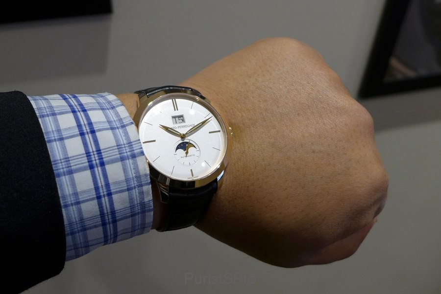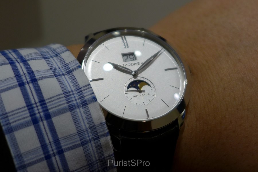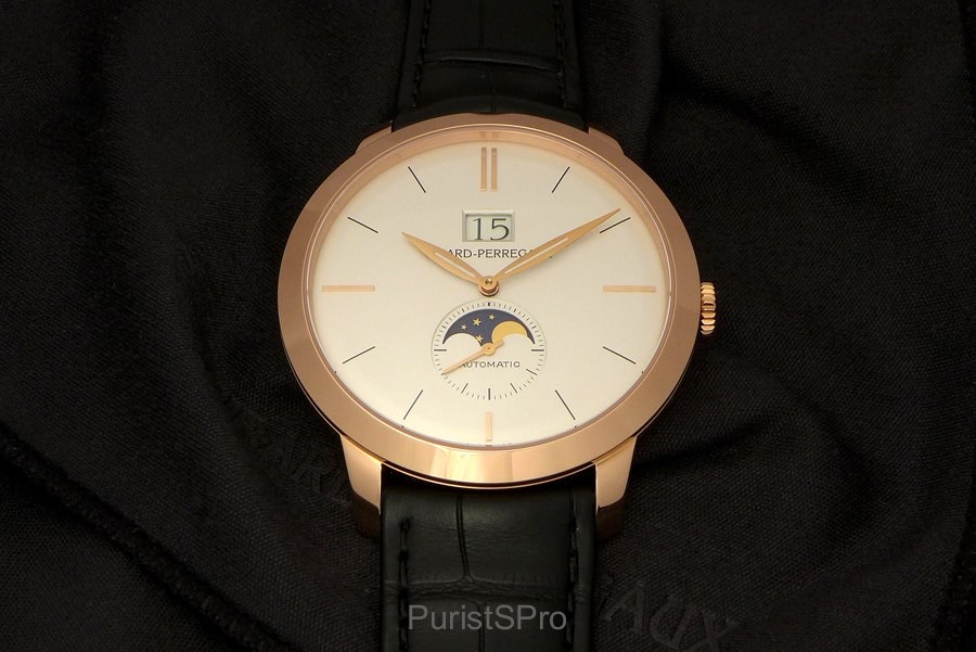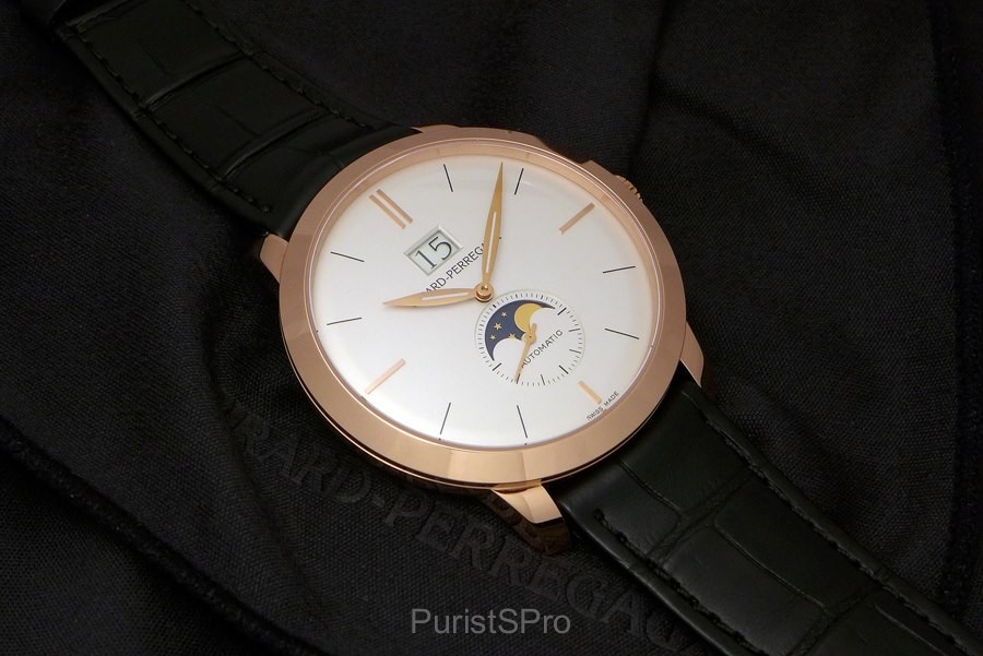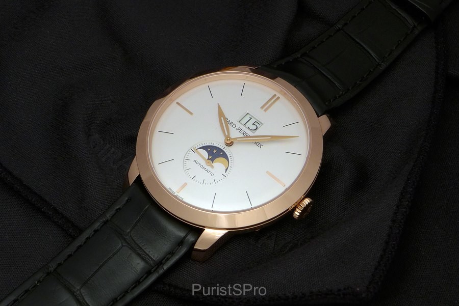 The focus is really on the complications! The Large Date overpowers the Girard-Perregaux logo and the sub-second with the golden moon face gives the dial the perfect harmony a classic watch should have.