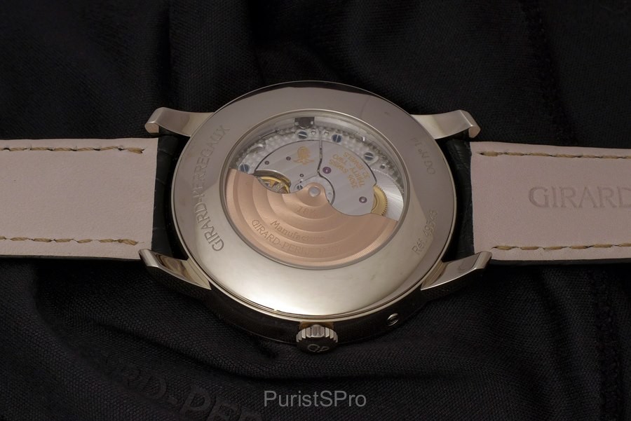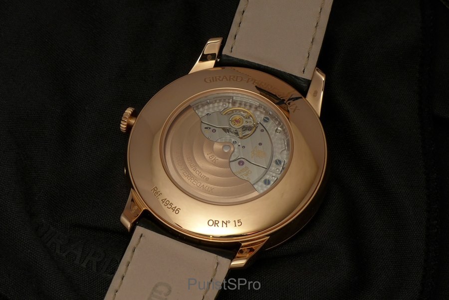 A quick look on the back shows the same caliber GP 03300-0110 but framed by a Pink Gold case back.