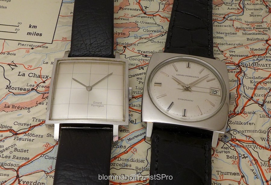 Two of the square watches we have been looking at during the past year are the Girard-Perregaux Damier, reference 7427 and the Gyromatic, reference 8888.