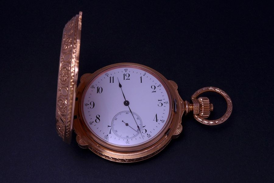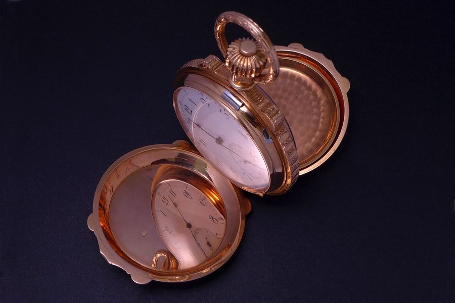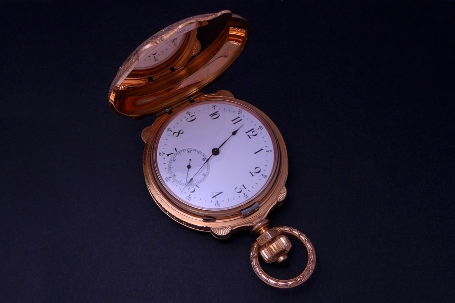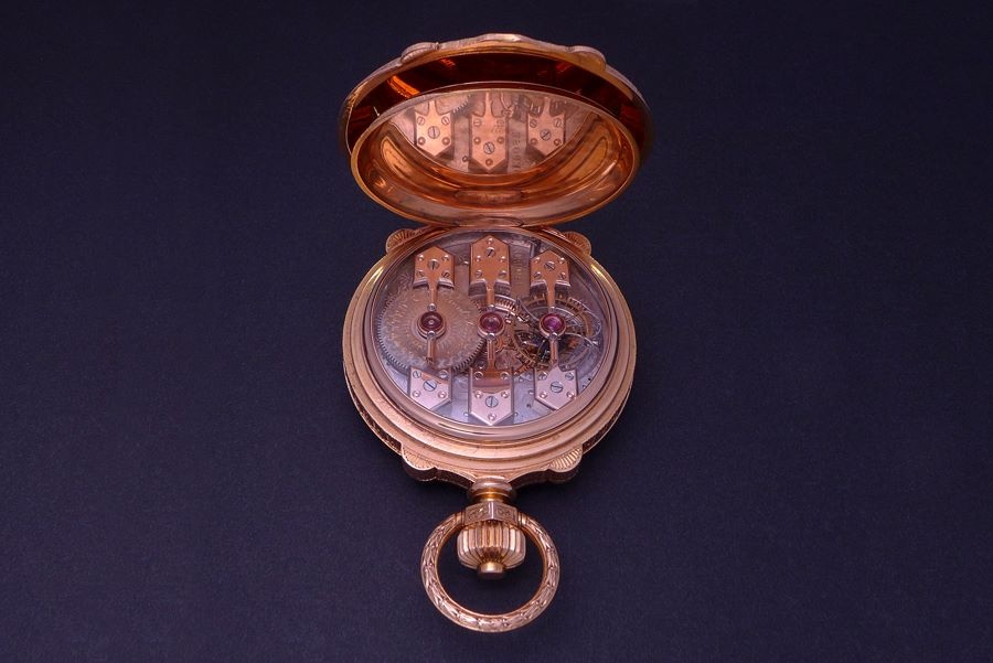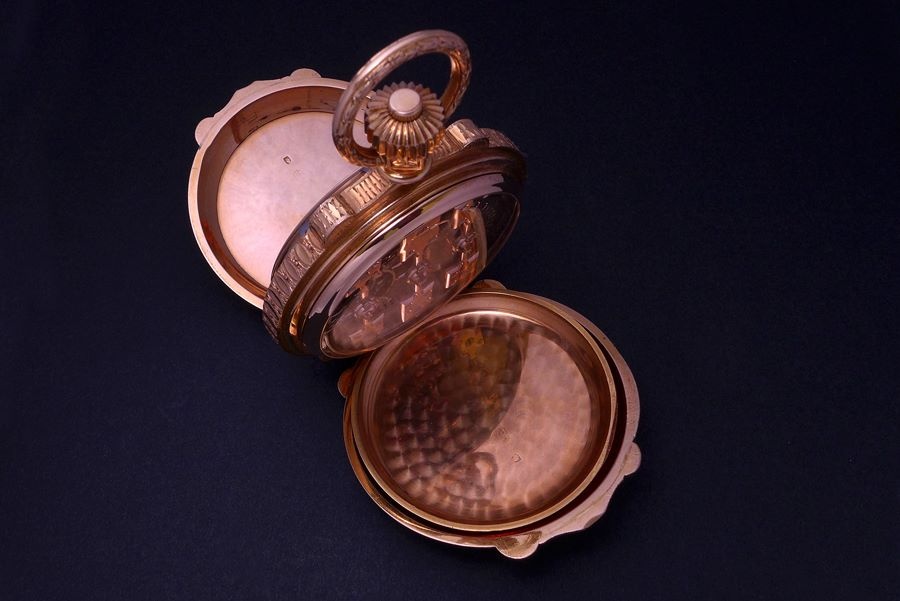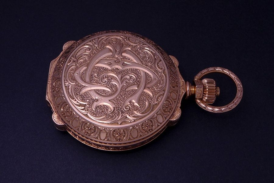 The Pink Gold hunter case was engraved by the Fritz Kundert, a local La Chaux-de Fonds master engraver with a workshop that was skilled in engraving, enameling and gem settings.