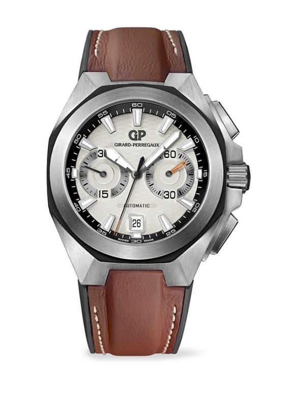 Inside is the automatic Calibre GP3300-0073 with chronograph module, 28,800vph, PR 46h, 61 jewels. Sapphire display back, WR to 100m. The automatic winding weight is shaped like an arrow and the solid shape compliments the case as well.