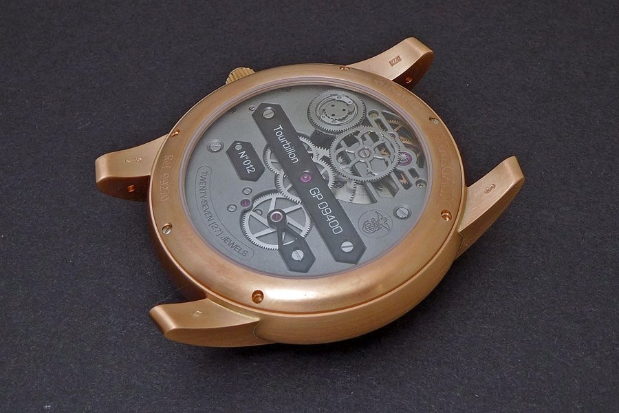 I love the fact that GP has kept the trinity also on the back of the watch. As you can see there are three (or at least two and a half) black titanium bridges on the back as well.
