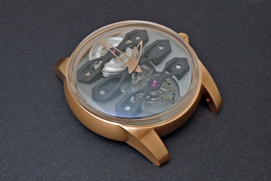 The quite large tourbillon (14.44 mm) completes a full rotation in 1 minute. 80 components – 0.25 grams!