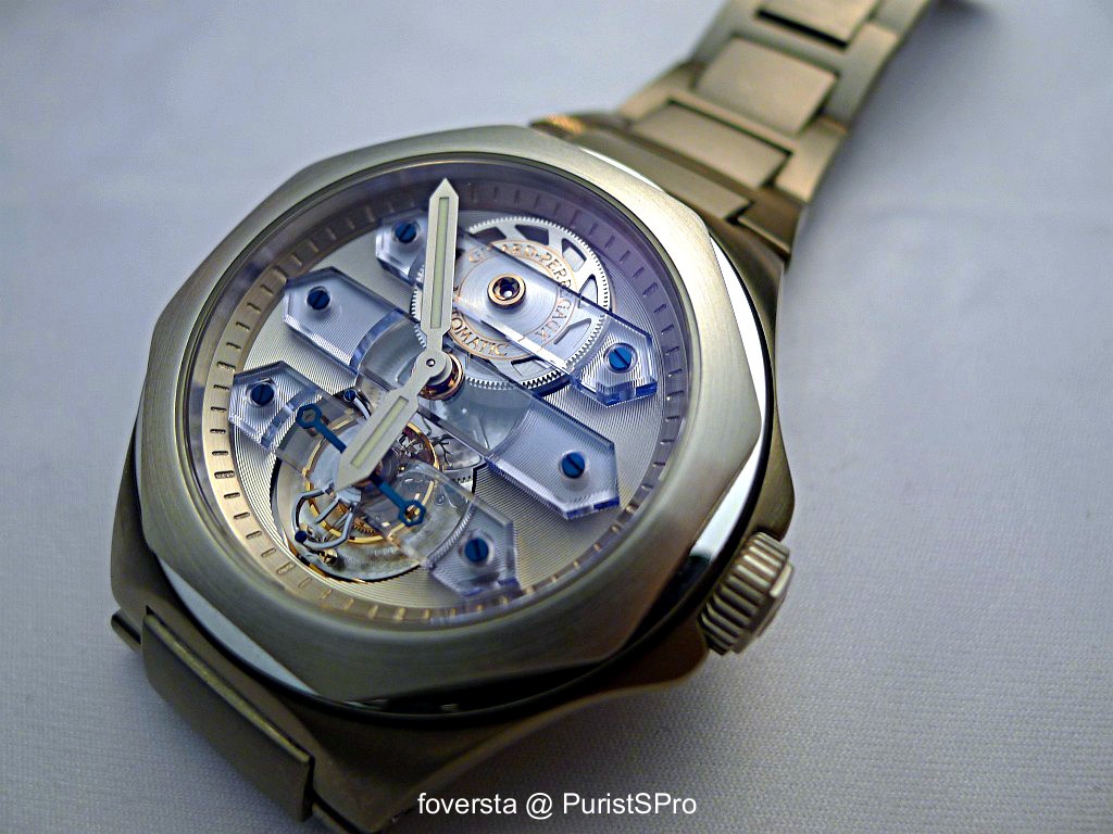 42,6 mm Titanium case with vertical satin-brushed finish makes the watch very comfortable on the wrist and the octogonal bezel, along with the bridges, enhance the geometric design of the watch.