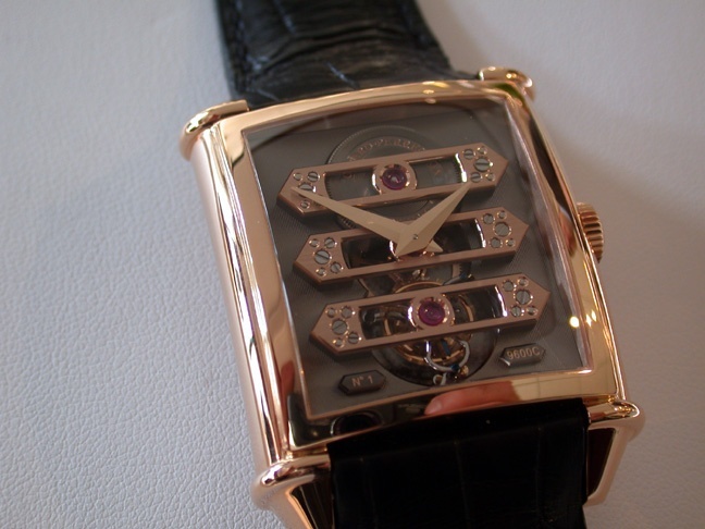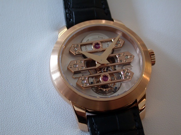 With my preference for round watches, I think my favorite is the limited edition (50 pieces) rose gold Tourbillon with Three Gold Bridges, with skeletonized straight bridges: