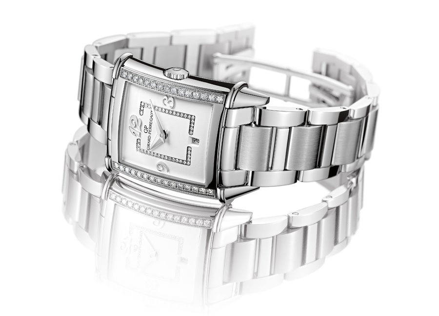 Flanked by its two lateral shafts, the steel case is delicately cambered. Each horn is set with 15 diamonds to form two dazzling rows of stones. At 12 o’clock and 6 o’clock two gadroons emphasize the lugs and give a structure to it as a whole. The case-back, secured by screws, is fitted with a sapphire crystal that affords a view of the movement’s oscillating weight, decorated with a tapestry motif. Technically and aesthetically outstanding, the caliber is among the smallest to be found in watchmaking, with its diameter of only 19.4 mm. Illustrating all of Girard-Perregaux’s savoir-faire and expertise, it offers hour, minute, and date functions.