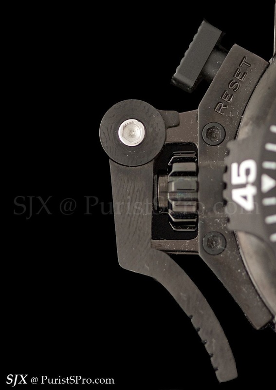 With its serrated edge the bezel is easy to grip and turn though why anyone would actually use this to dive is beyond me. That being said the thick and sharp bezel certainly adds to the aggressive look of the watch.