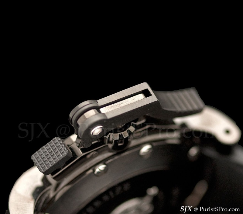 The Chronofigther is all about the chronograph lever. It is a preposterous, massive and aggressive contraption that erupts from the side of the case. Wars have been won with less equipment. Wear this through airport security and the dogs will be let loose. Children point and stare while adults avert their gaze.