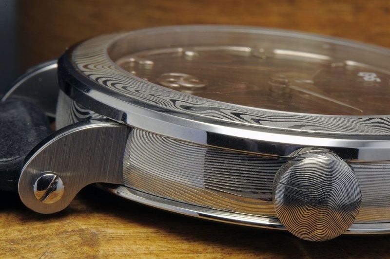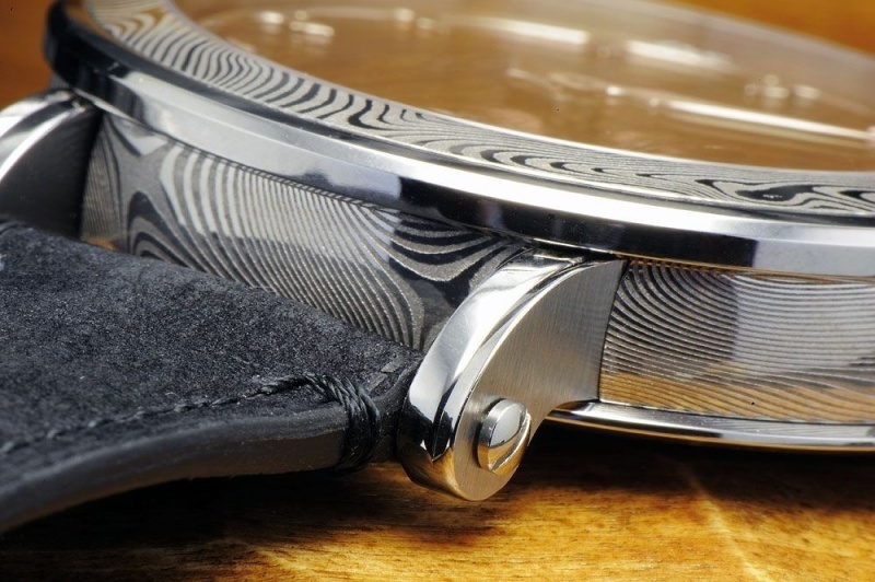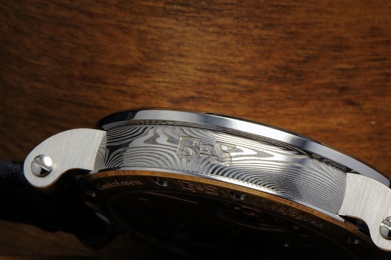 The watch case of stainless damascus steel is based on the previous distinctive GoS cases to accentuate the damascus steel features by mirroring the pattern in highgloss polished bezel and case back.