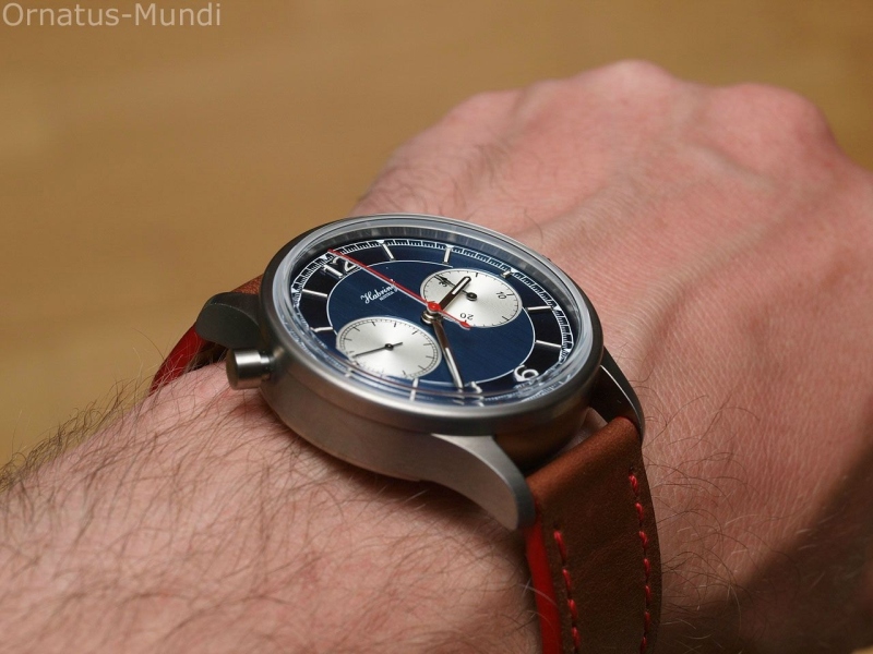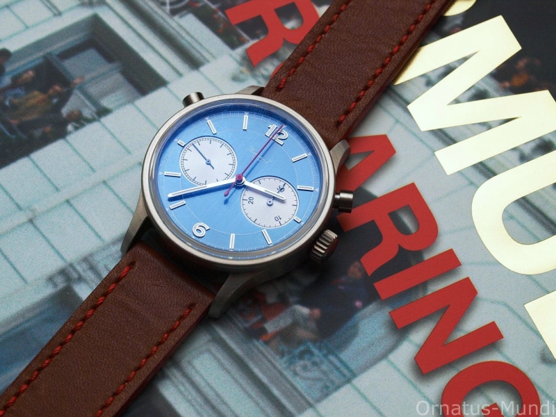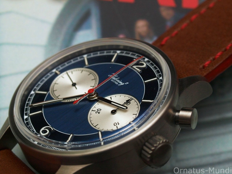 Nice view on the two seconds counters pointing to the rattrapante mechanism of the movement. clearly visible also is the domed sapphire crystal, which certainly adds to the vintage appearance of the watch: