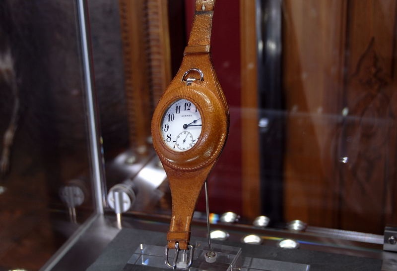 [A pocket watch in the Hermès leather pocket watch wrist strap]